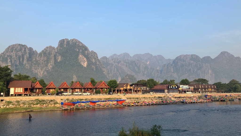 Arriving in Vang Vieng (152km / 3.5hours) you realise why this has been a tourist mecca for so many years. Stunning mountain backdrops to a wide calm river. Looks like paradise!