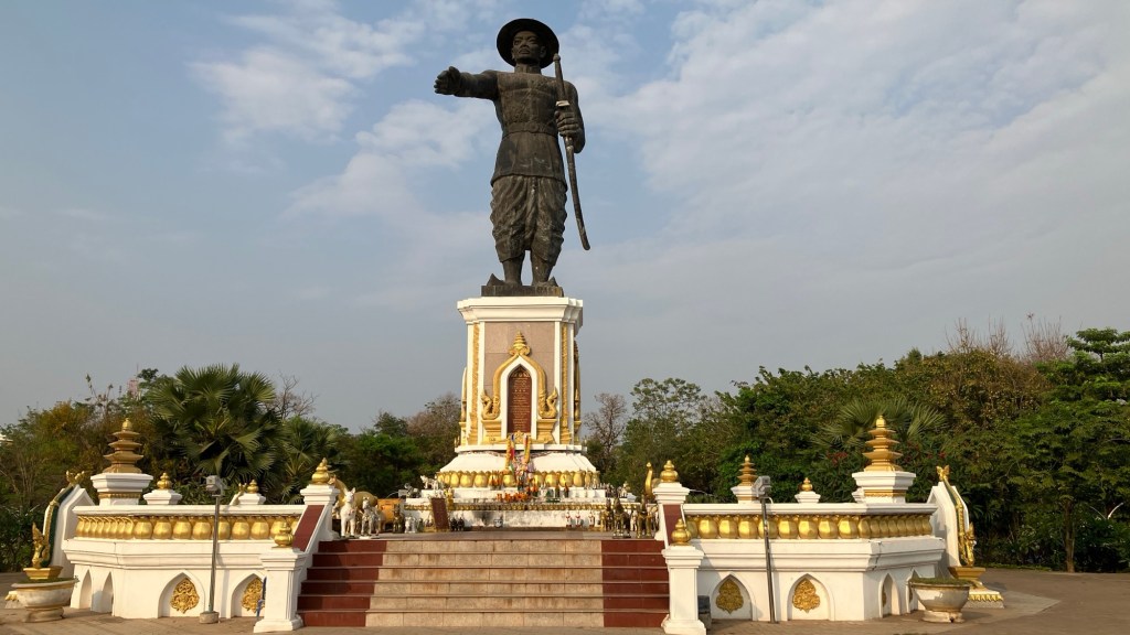 Next visit was to the riverside park where the night market sets up. An interesting, but modern, statue to Chao Anouvong King of Vientiane back around 1805 for a short while. Laos had 3 kingdoms at the time (Vientiane, Champasak, and Luang Prabang). All were under Siam control at the time. When Rama III set brutal policies against Lao people such as tattooing them to identify them, the king launched a failed rebellion. Siam destroyed Vientiane and Chao Anouvong was caged on display in Bangkok until he died. He is still considered a founding father of modern Laos.